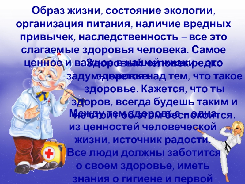 Между тем здоровье – одна из ценностей человеческой жизни, источник радости. Все люди должны заботится о своем здоровье, иметь знания о гигиене и первой медицинской помощи