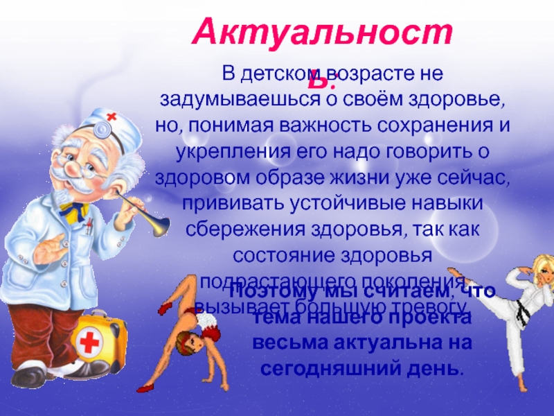 В детском возрасте не задумываешься о своём здоровье, но, понимая важность сохранения и укрепления его надо говорить о здоровом образе жизни уже сейчас, прививать устойчивые навыки сбережения здоровья, так как состояние здоровья подрастающего поколения вызывает большую тревогу.