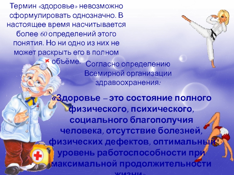 Термин «здоровье» невозможно сформулировать однозначно. В настоящее время насчитывается более 60 определений этого понятия. Но ни одно из них не может раскрыть его в полном объёме.