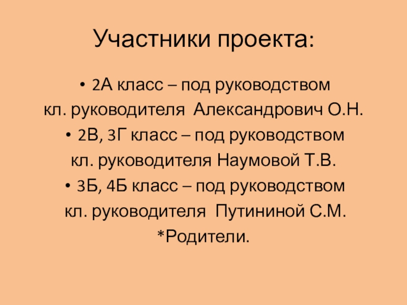 Участники проекта:2А класс – под руководством кл. руководителя Александрович О.Н.2В, 3Г класс – под руководством  кл.