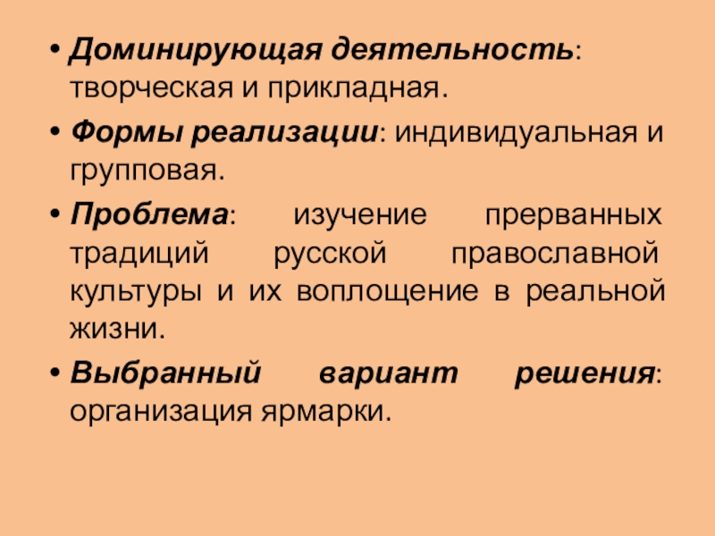 Доминирующая деятельность: творческая и прикладная.Формы реализации: индивидуальная и групповая.Проблема: изучение прерванных традиций русской православной культуры и их
