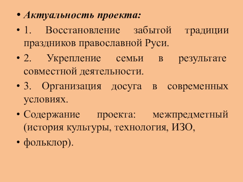 Актуальность проекта:1. Восстановление забытой традиции праздников православной Руси.2. Укрепление семьи в результате совместной деятельности.3. Организация досуга в