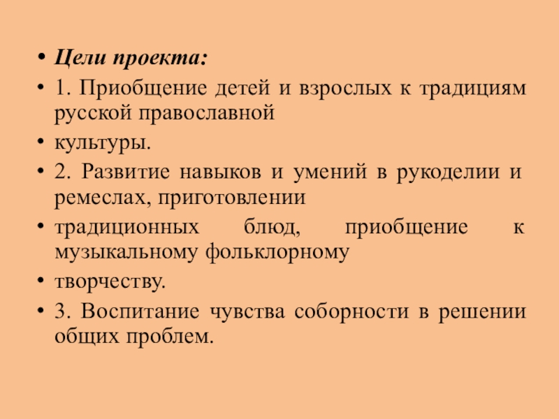 Цели проекта:1. Приобщение детей и взрослых к традициям русской православнойкультуры.2. Развитие навыков и умений в рукоделии и