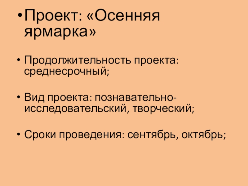 Проект: «Осенняя ярмарка»Продолжительность проекта: среднесрочный;Вид проекта: познавательно-исследовательский, творческий;Сроки проведения: сентябрь, октябрь;