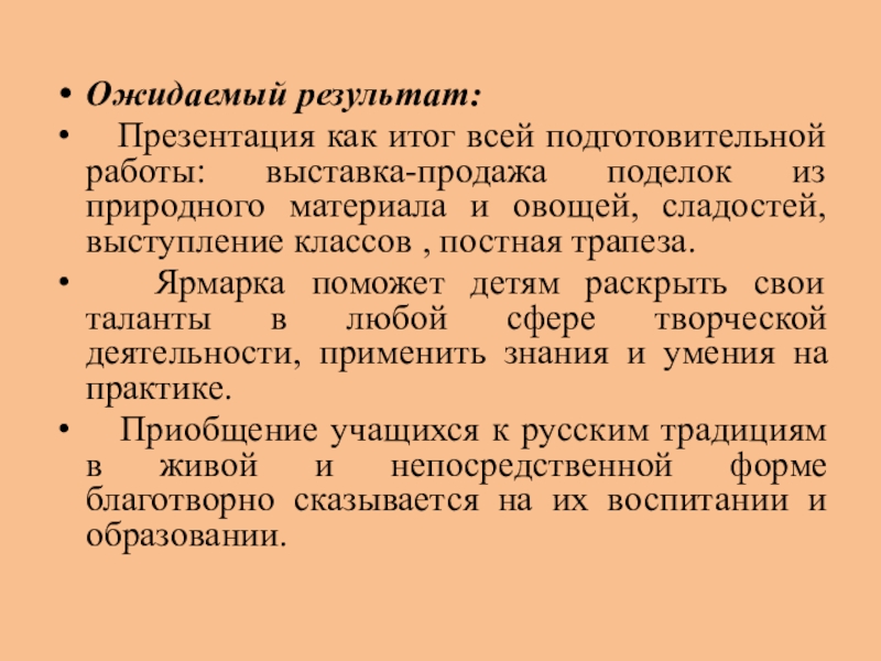 Ожидаемый результат:  Презентация как итог всей подготовительной работы: выставка-продажа поделок из природного материала и овощей, сладостей,