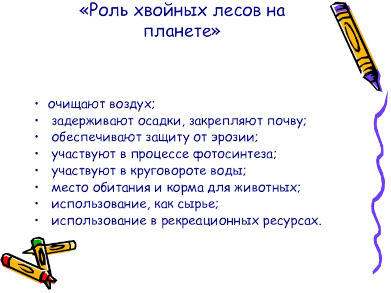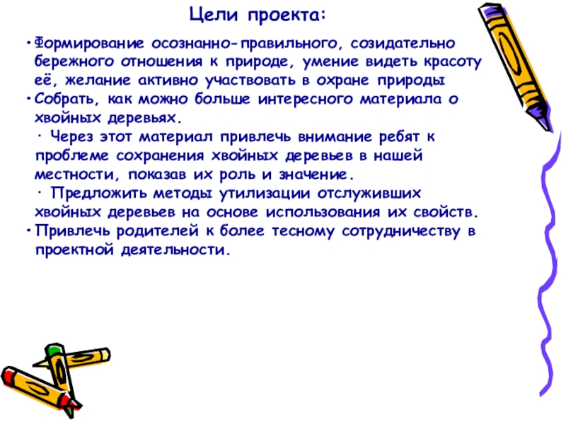 · Через этот материал привлечь внимание ребят к проблеме сохранения хвойных деревьев в нашей местности, показав их роль и значение.