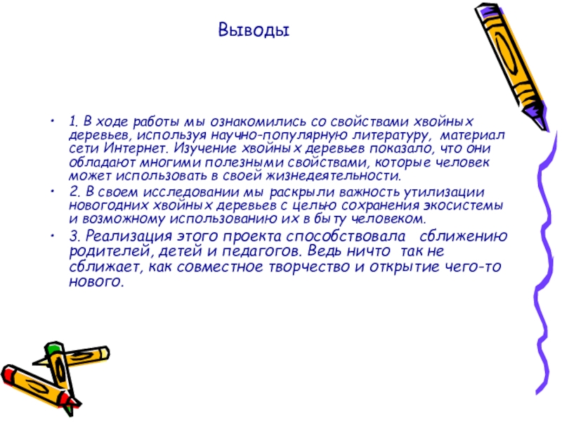 1. В ходе работы мы ознакомились со свойствами хвойных деревьев, используя
