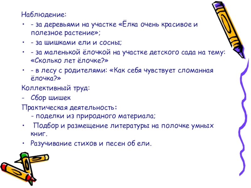 елку в соответствии с содержанием стихотворения, рисовать на ветвях шишки, снег; вносить в рисунок дополнения, обогащающие его содержание.