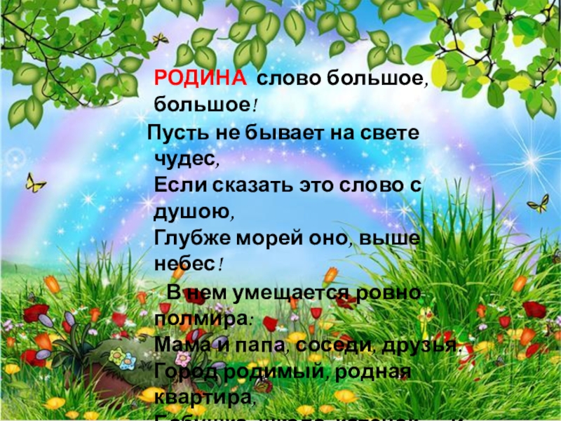 РОДИНА слово большое, большое! Пусть не бывает на свете чудес, Если сказать это слово с душою, Глубже морей оно, выше небес! В нем умещается ровно полмира: Мама и папа, соседи, друзья. Город родимый,