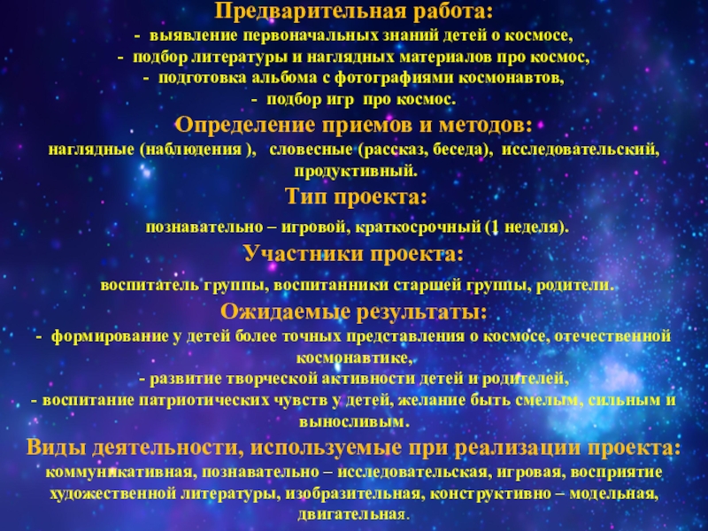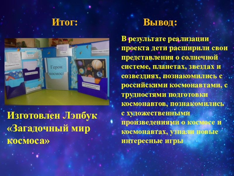 В результате реализации проекта дети расширили свои представления о солнечной системе, планетах, звездах и созвездиях, познакомились с российскими космонавтами, с трудностями подготовки космонавтов, познакомились с художественными произведениями о космосе и космонавтах, узнали новые интересные игры