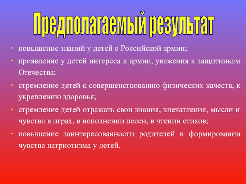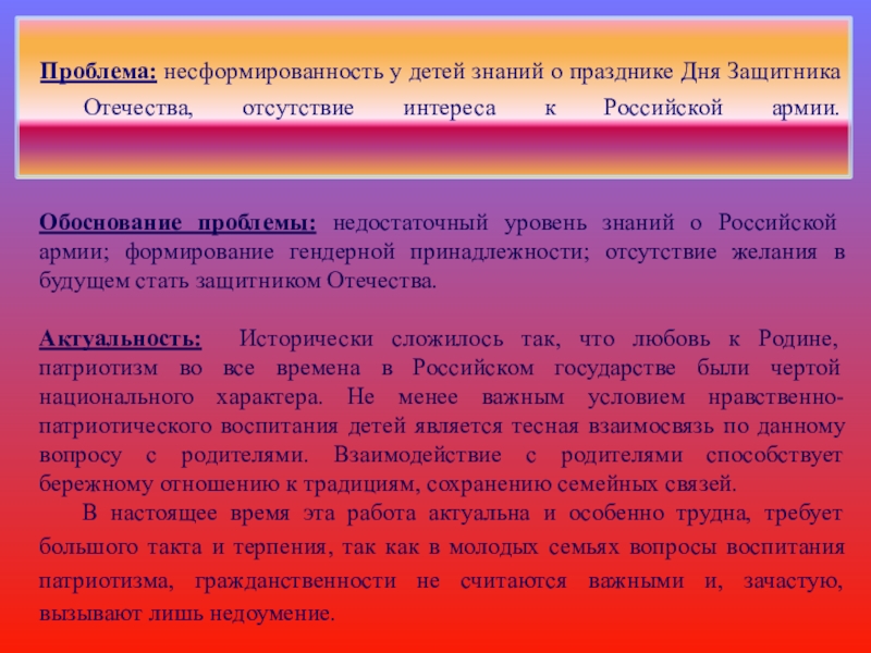 Обоснование проблемы: недостаточный уровень знаний о Российской армии; формирование гендерной принадлежности; отсутствие желания в будущем стать защитником Отечества.