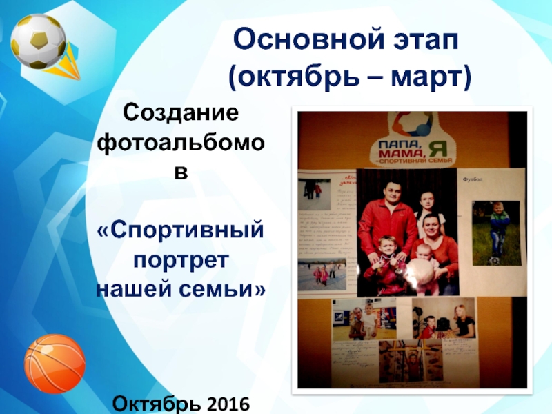 Основной этап (октябрь – март)Создание фотоальбомов «Спортивный портрет нашей семьи»Октябрь 2016