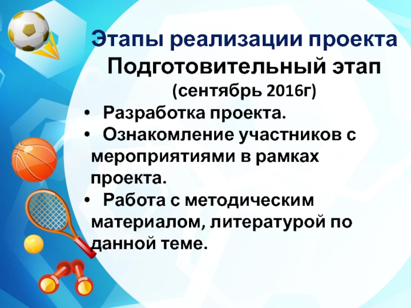 Этапы реализации проектаПодготовительный этап (сентябрь 2016г)  Разработка проекта.  Ознакомление участников с мероприятиями в рамках проекта.