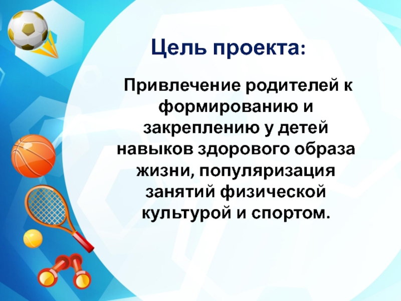 Цель проекта: Привлечение родителей к формированию и закреплению у детей навыков здорового образа жизни, популяризация занятий
