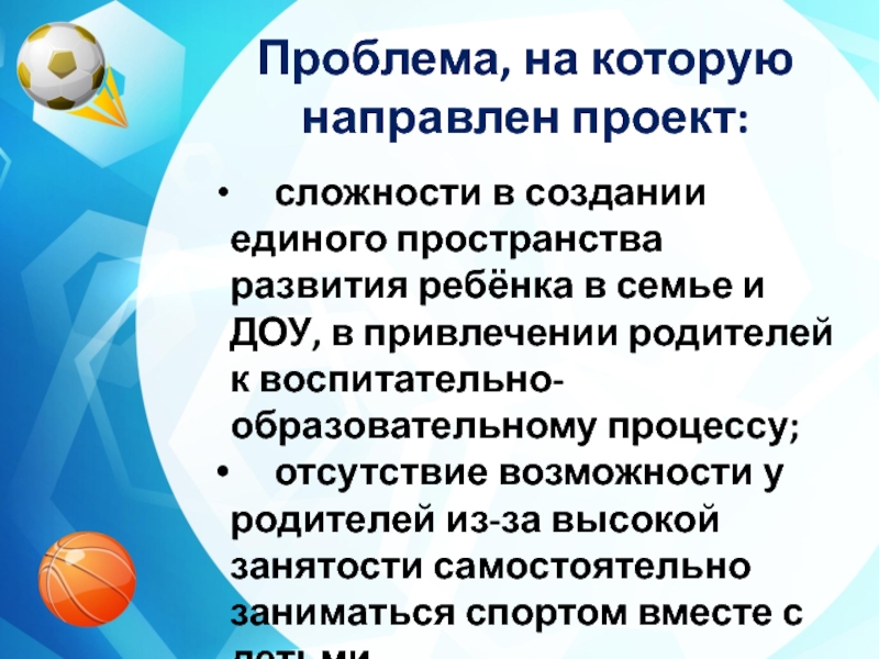 Проблема, на которую направлен проект: сложности в создании единого пространства развития ребёнка в семье и ДОУ, в привлечении родителей к воспитательно-образовательному процессу; отсутствие возможности у родителей из-за высокой занятости самостоятельно заниматься спортом вместе с детьми.