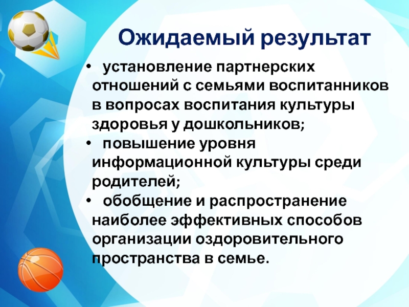 Ожидаемый результат  установление партнерских отношений с семьями воспитанников в вопросах воспитания культуры здоровья у дошкольников;