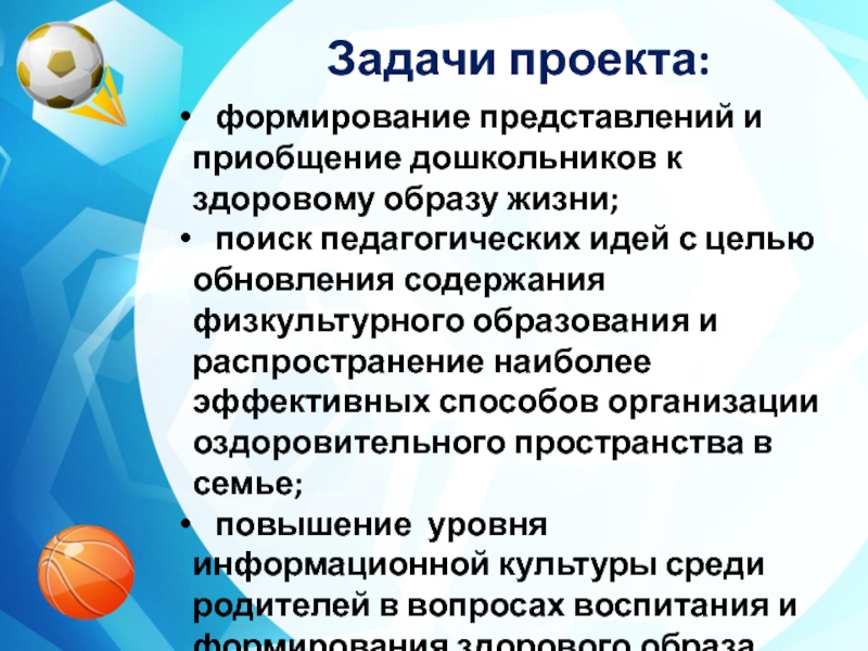 Задачи проекта:  формирование представлений и приобщение дошкольников к здоровому образу жизни;  поиск педагогических идей с