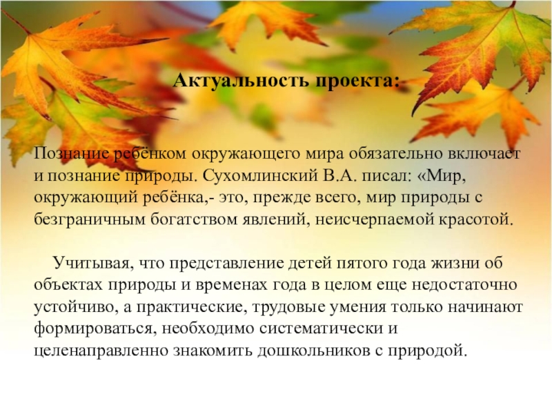 Сухомлинский В.А. писал: «Мир, окружающий ребёнка,- это, прежде всего, мир природы с безграничным богатством явлений, неисчерпаемой красотой.
