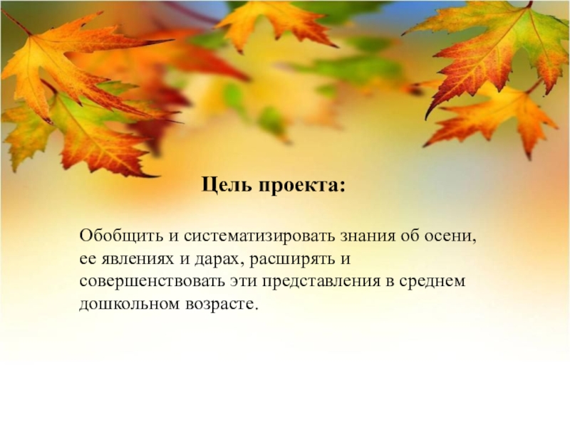 Обобщить и систематизировать знания об осени, ее явлениях и дарах, расширять и совершенствовать эти представления в среднем дошкольном возрасте.