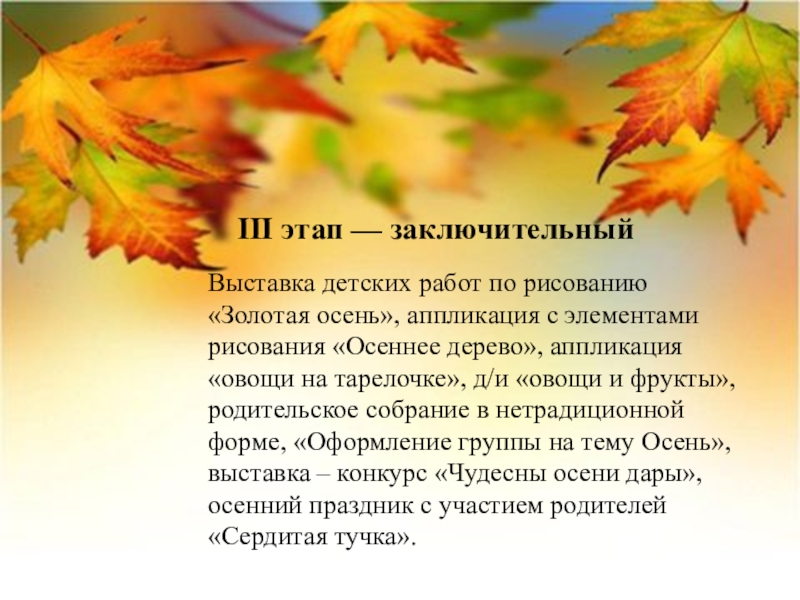 4.Создание мультимедийной презентации «Осень к нам пришла» тематическими частями.