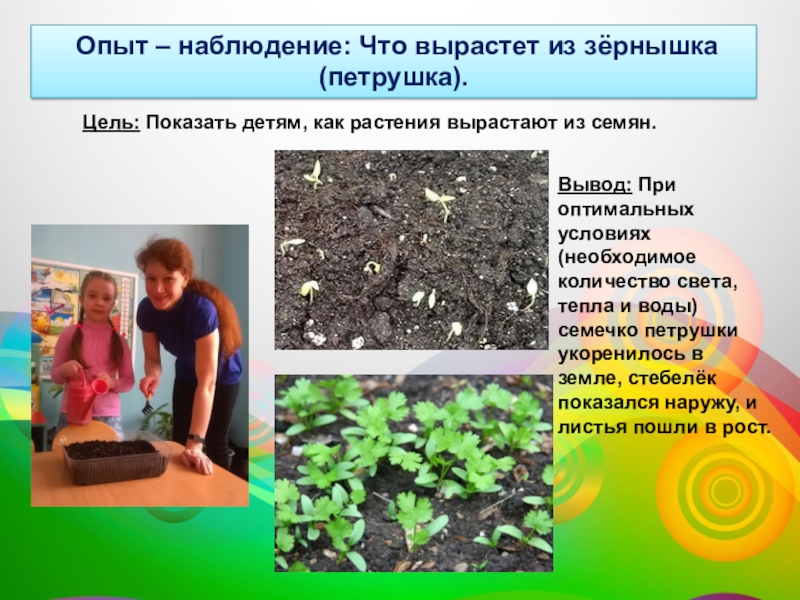 Вывод: При оптимальных условиях (необходимое количество света, тепла и воды) семечко петрушки укоренилось в земле, стебелёк показался наружу, и листья пошли в рост.