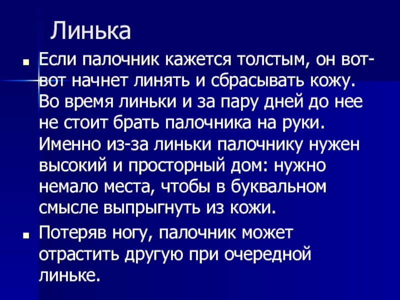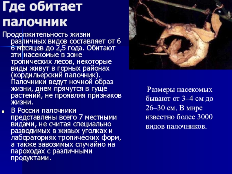 Размеры насекомых бывают от 3–4 см до 26–30 см. В мире известно более 3000 видов палочников.