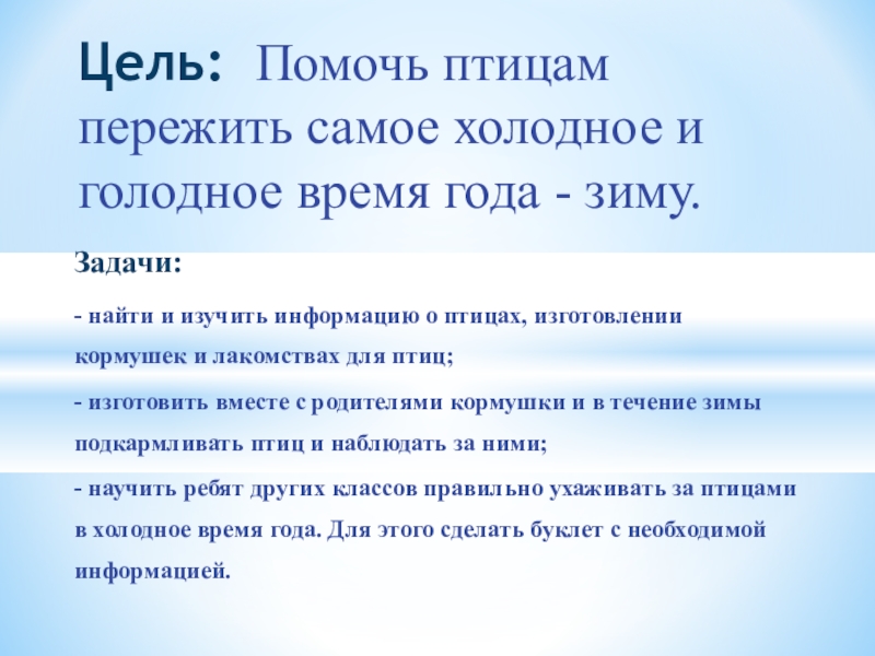 Цель: Помочь птицам пережить самое холодное и голодное время года - зиму.