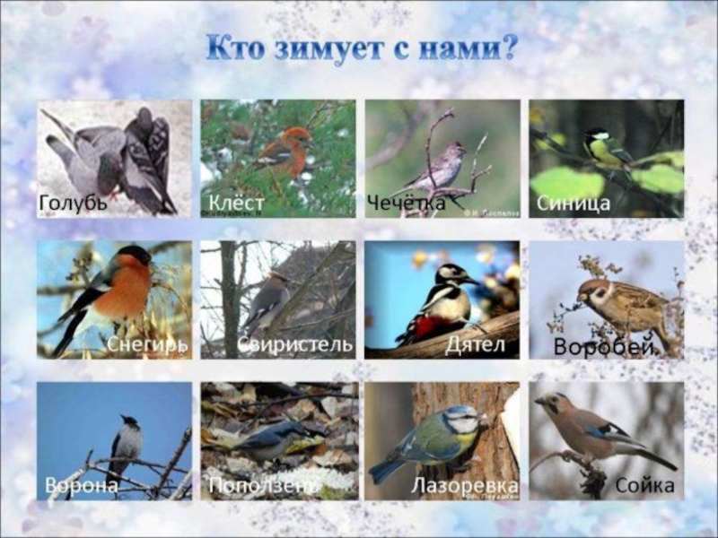 (ворона, воробьи, голуби, сорока, дятел ,синицы ) .
