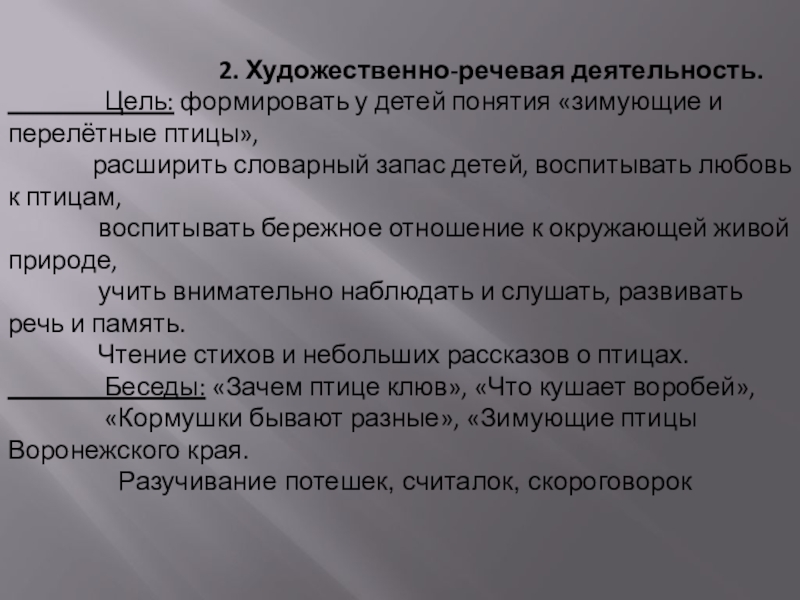 Цель: формировать у детей понятия «зимующие и перелётные птицы»,