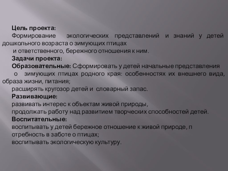 Тема проекта в младшей группе «Зимующие птицы» выбрана мной не случайно. Ведь именно птицы окружают нас круглый год, принося людям пользу и радость. И мы, педагоги, совместно с родителями, должны научить воспитанников беречь живую природу, пополняя свои знания о зимующих птицах, их повадках и образе жизни, создать условия для общения ребенка с миром природы.