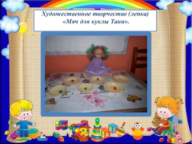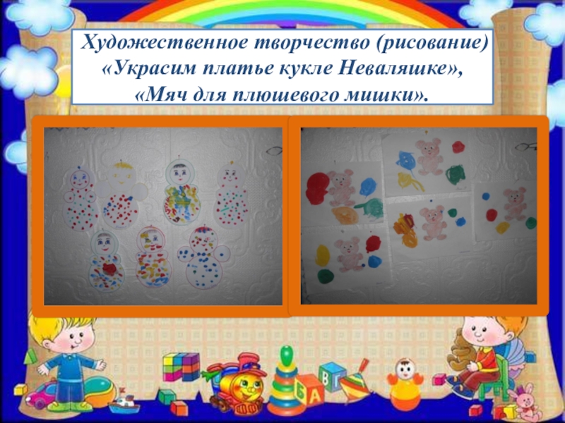 Слайд 13Художественное творчество (рисование) «Украсим платье кукле Неваляшке», «Мяч для плюшевого мишки».
