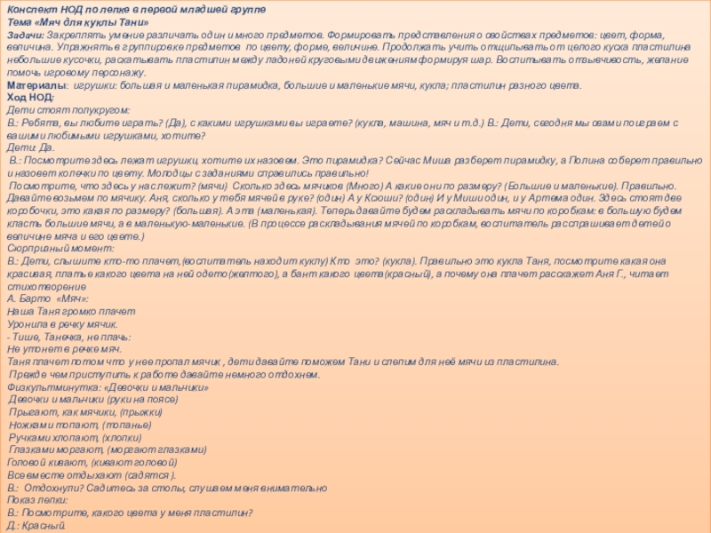 Проведение НОД: по лепке «Мяч для куклы Тани»; по развитию речи «Игрушки в гостях у ребят», по ознакомлению с предметным миром «Игрушки».