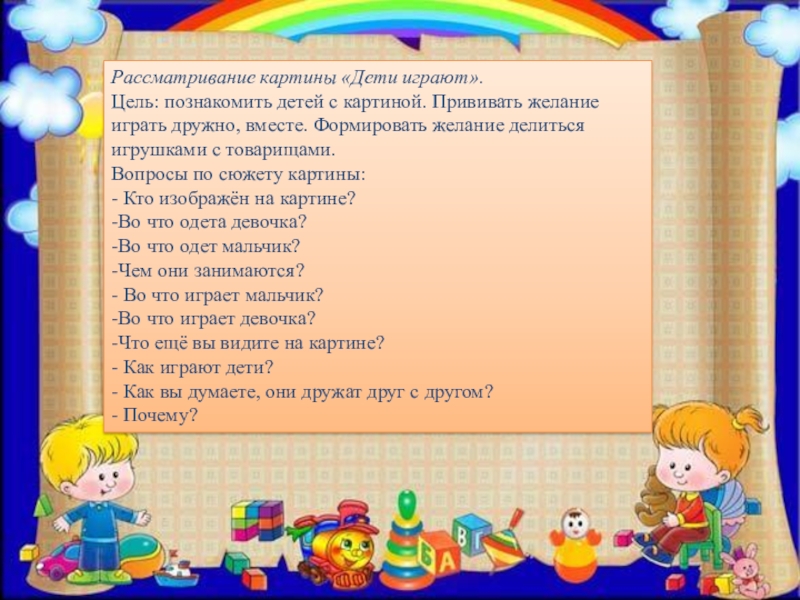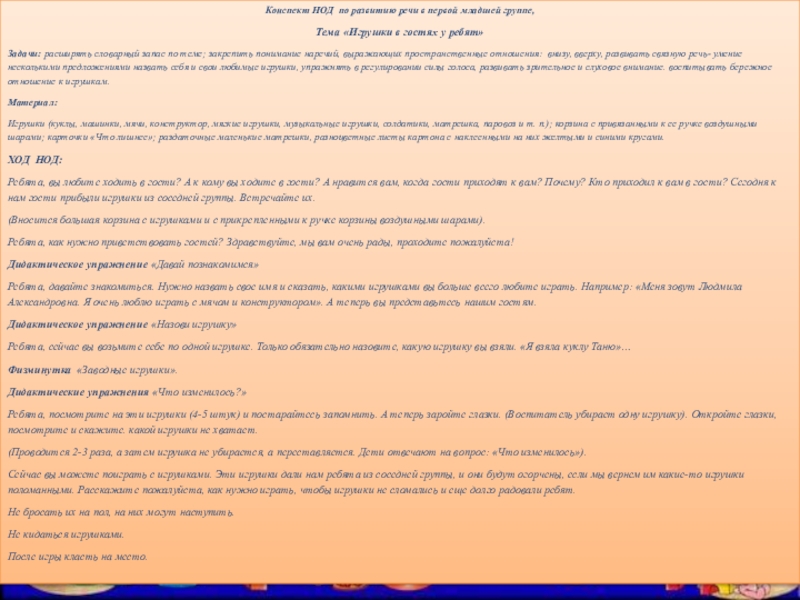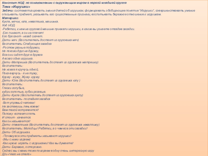 Воспитатель: Хорошо мы с вами сегодня поиграли. Вам понравилось? А о чем мы с вами сегодня говорили (об игрушках)