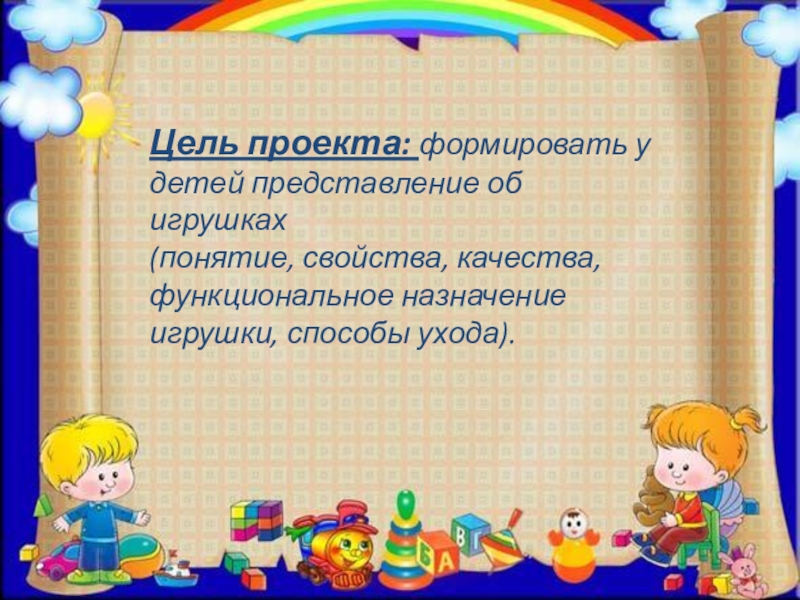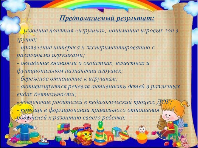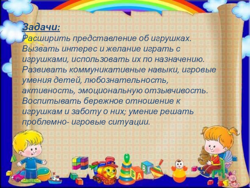 - овладение знаниями о свойствах, качествах и функциональном назначении игрушек;