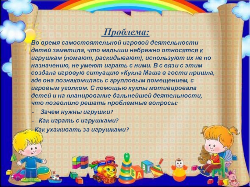 Во время самостоятельной игровой деятельности детей заметила, что малыши небрежно относятся к игрушкам (ломают, раскидывают), используют их не по назначению, не умеют играть с ними. В с вязи с этим создала игровую ситуацию «Кукла Маша в гости пришла, где она познакомилась с групповым помещением, с игровым уголком. С помощью куклы мотивировала детей и на планирование дальнейшей деятельности, что позволило решать проблемные вопросы: