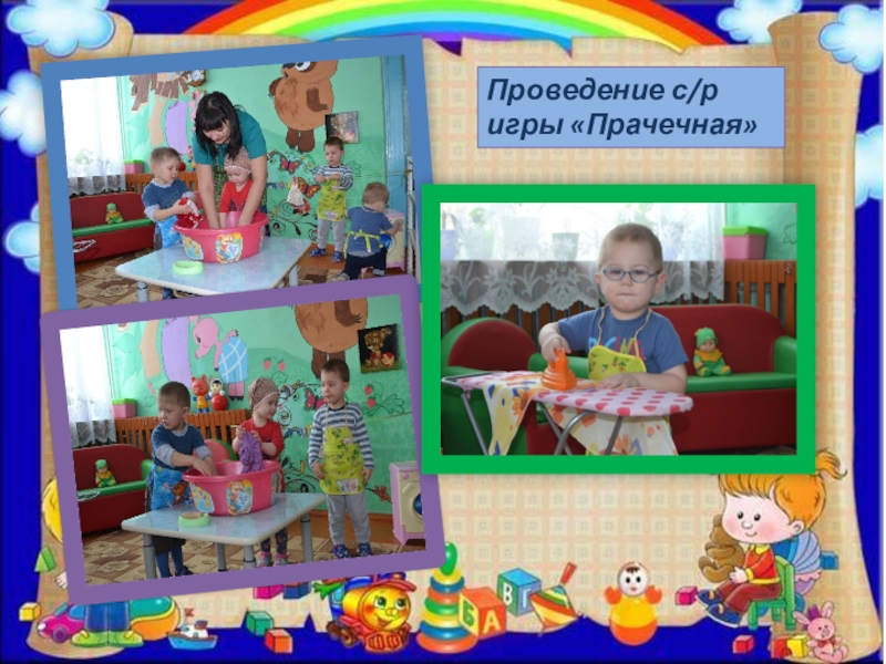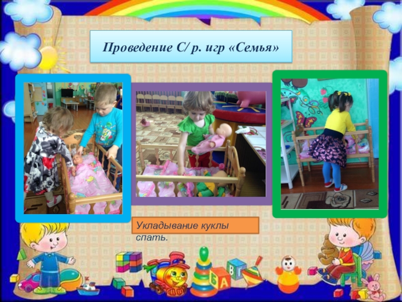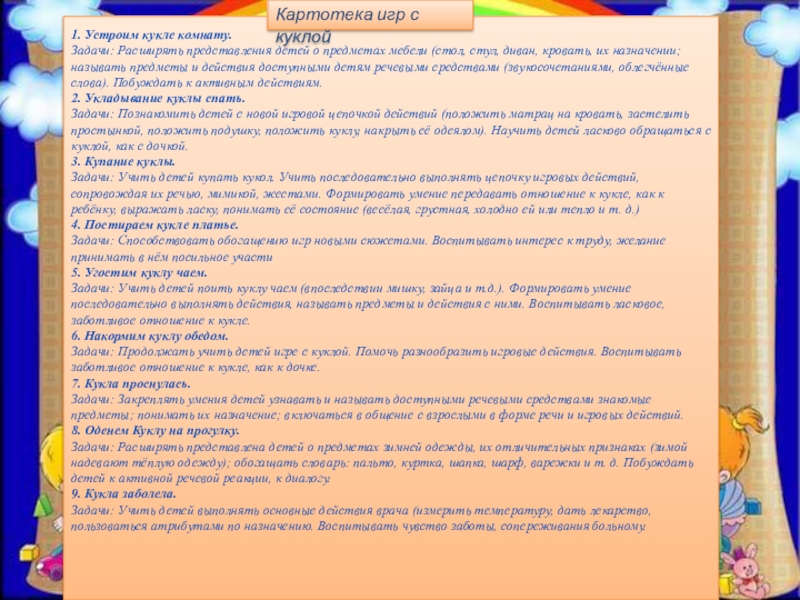 - Проведение с/р игр: «Напоем куклу Катю чаем», «Уложи куклу спать», «Кукла Катя заболела», «Прачечная».