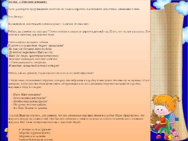 Воспитывать бережное отношение к игрушкам и заботу о них; умение решать проблемно- игровые ситуации.