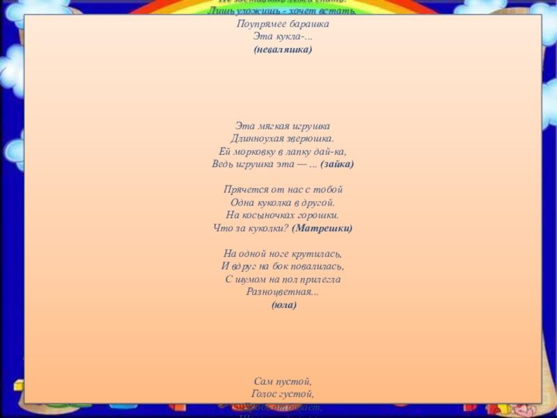 Воспитатель: Сейчас я посмотрю можете ли вы отгадать по описанию игрушку.
