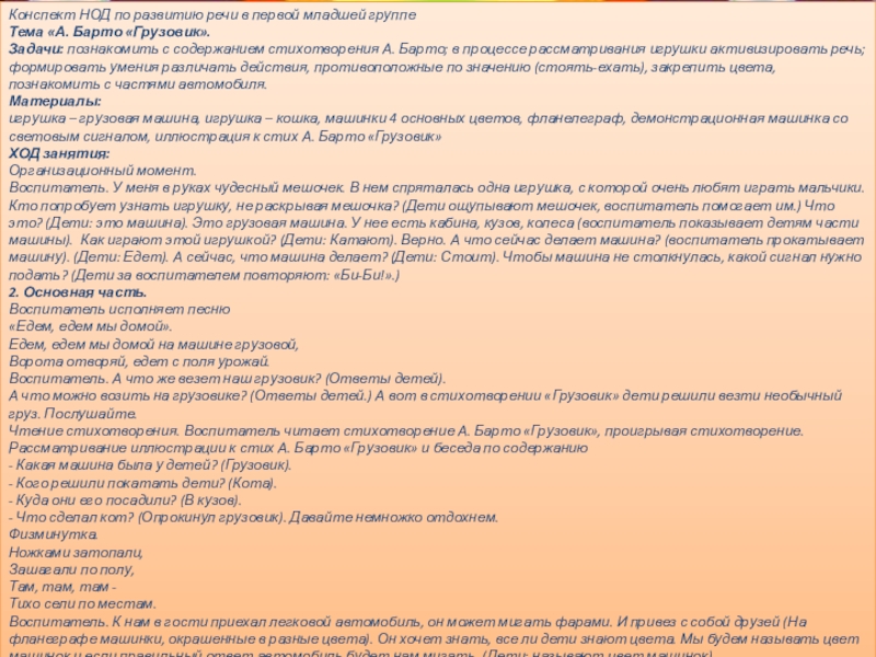 детьми стихи А. Л. Барто, развивать интерес к художественному слову;