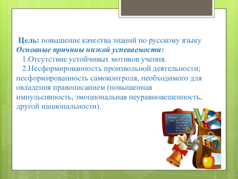 Слайд 7 Цель: повышение качества знаний по русскому языку