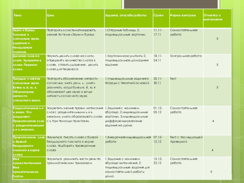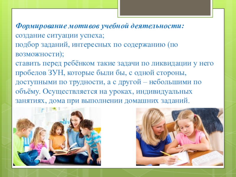 ставить перед ребёнком такие задачи по ликвидации у него пробелов ЗУН, которые были бы, с одной стороны, доступными по трудности, а с другой – небольшими по объёму. Осуществляется на уроках, индивидуальных занятиях, дома при выполнении домашних заданий.