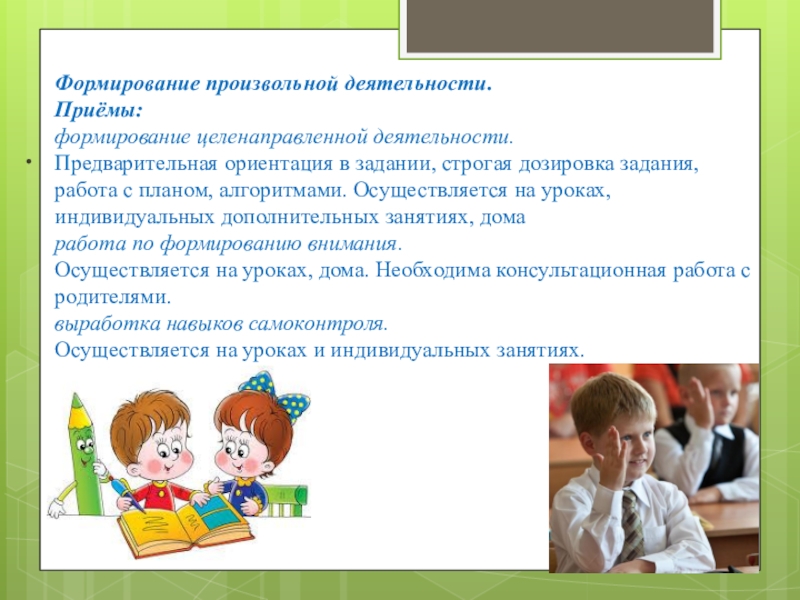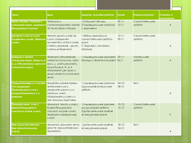 работа с планом, алгоритмами. Осуществляется на уроках, индивидуальных дополнительных занятиях, дома