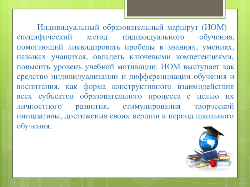 обучения, помогающий ликвидировать пробелы в знаниях, умениях, навыках учащихся, овладеть ключевыми компетенциями, повысить уровень учебной мотивации. ИОМ выступает как средство индивидуализации и дифференциации обучения и воспитания, как форма конструктивного взаимодействия всех субъектов образовательного процесса с целью их личностного развития, стимулирования творческой инициативы, достижения своих вершин в период школьного обучения.