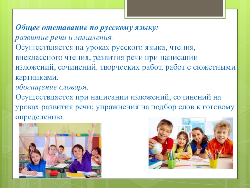Осуществляется при написании изложений, сочинений на уроках развития речи; упражнения на подбор слов к готовому определению.