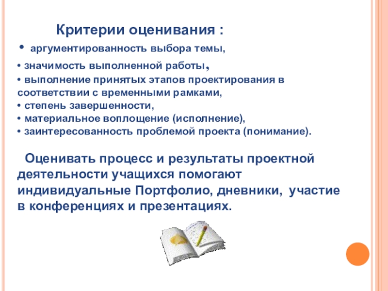 Оценивать процесс и результаты проектной деятельности учащихся помогают индивидуальные Портфолио, дневники, участие в конференциях и презентациях.