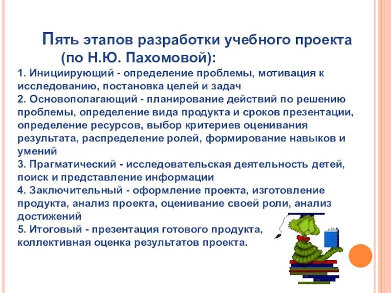 2. Основополагающий - планирование действий по решению проблемы, определение вида продукта и сроков презентации, определение ресурсов, выбор критериев оценивания результата, распределение ролей, формирование навыков и умений