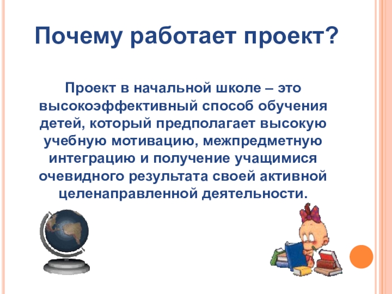детей, который предполагает высокую учебную мотивацию, межпредметную интеграцию и получение учащимися очевидного результата своей активной целенаправленной деятельности.