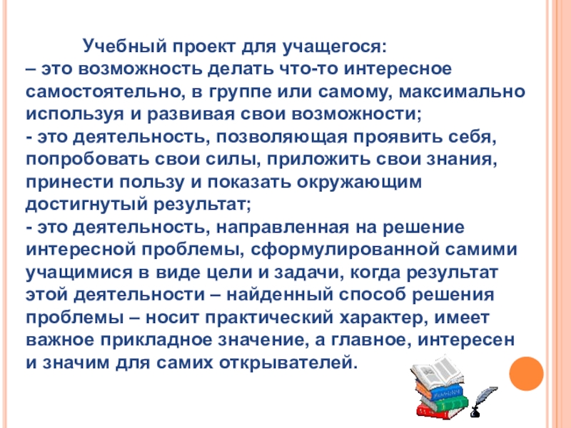 - это деятельность, направленная на решение интересной проблемы, сформулированной самими учащимися в виде цели и задачи, когда результат этой деятельности – найденный способ решения проблемы – носит практический характер, имеет важное прикладное значение, а главное, интересен и значим для самих открывателей.