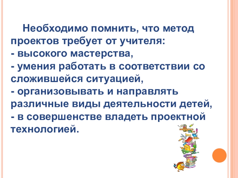 Слайд 11 Необходимо помнить, что метод проектов требует от учителя: