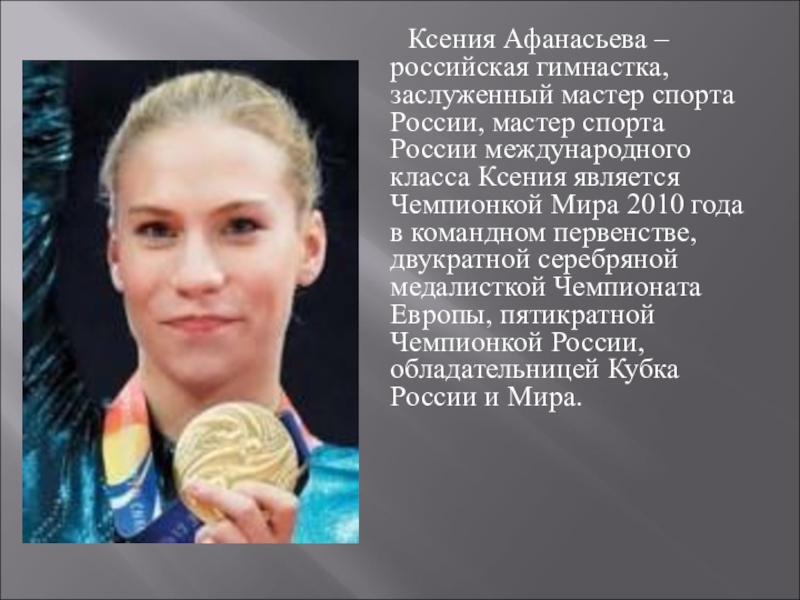 Слайд 19Ксения Афанасьева – российская гимнастка, заслуженный мастер спорта России, мастер спорта